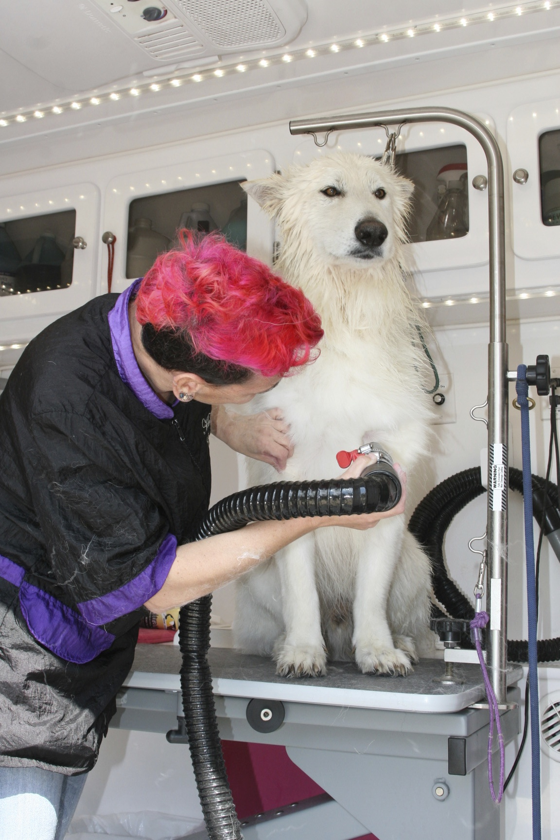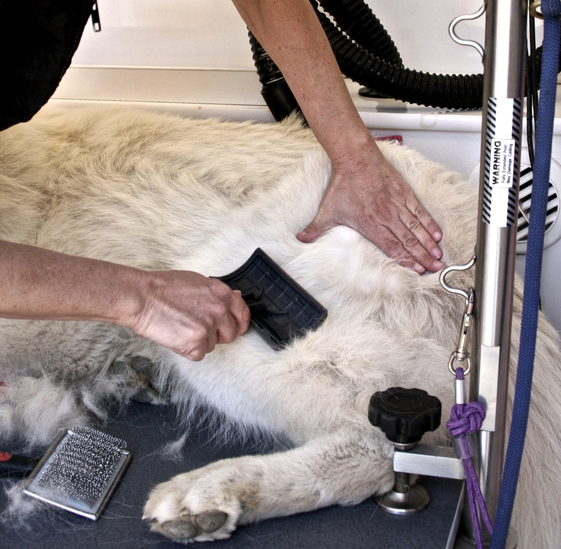 Put a non-slip rubber mat in the tub, and then use a hand-held hose attachment with warm water, testing with the back of your hand to insure the temperature is not too high. Wet your dog’s coat thoroughly, and then apply the shampoo, working from the back of the head and neck downwards. Shampoo and rinse by sections. Since you want to avoid water in the ears and nose, and shampoo in the eyes, the face can be washed with a damp cloth. You might find it helpful to improvise a step-up device to help your Berger Blanc Suisse to get in and out of the tub. Diluting the shampoo with water helps it go on evenly and extend further. Since your White Swiss Shepherd has a thick coat, he needs to be dried thoroughly, especially before going out in cold weather. Start off with a vigorous towel-drying, then use a hair dryer on a low-heat setting, holding it 10-12 inches from the coat. Without a hair dryer it can take a very long time for the coat to air dry, in particular if you are not in a dry climate.