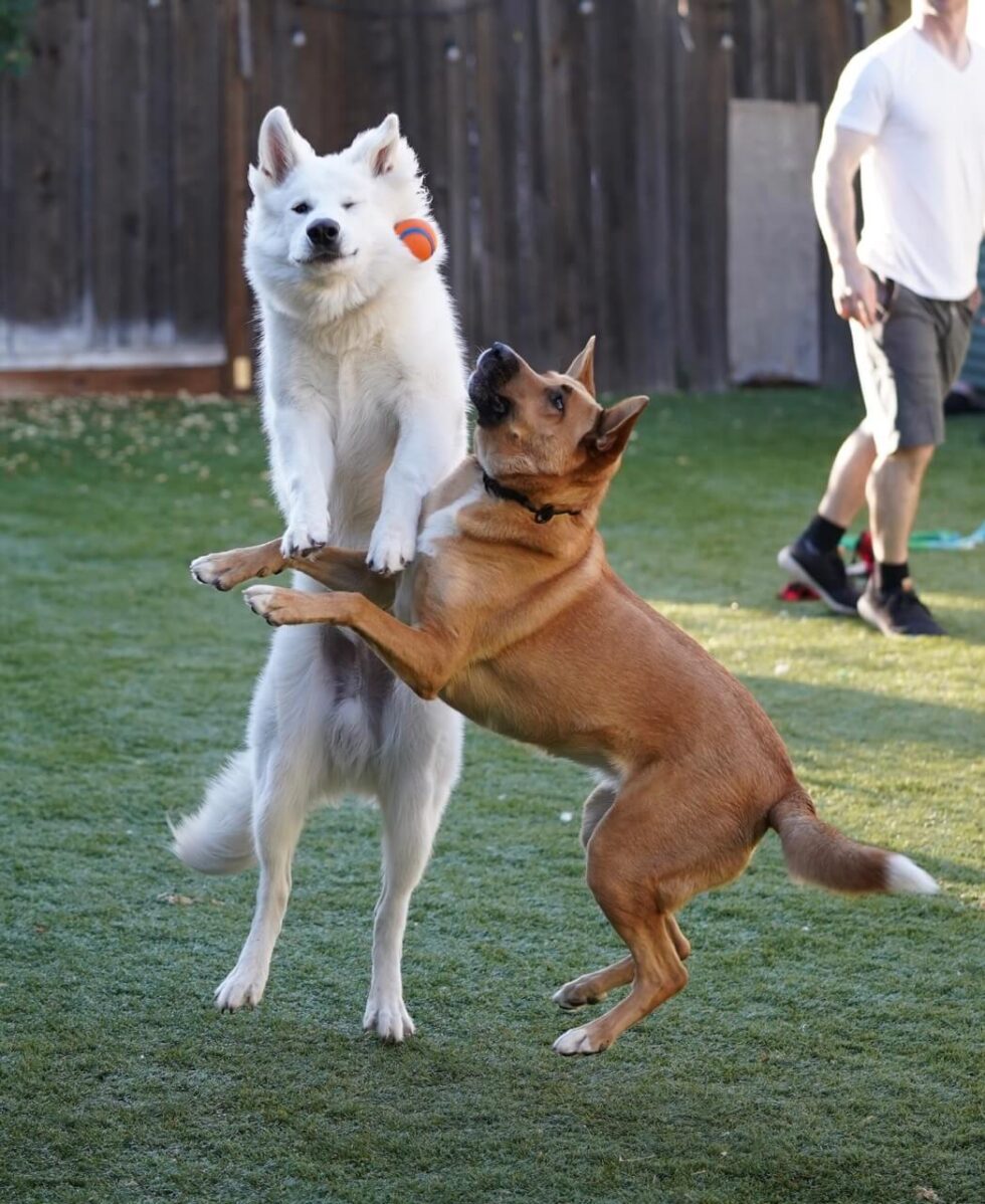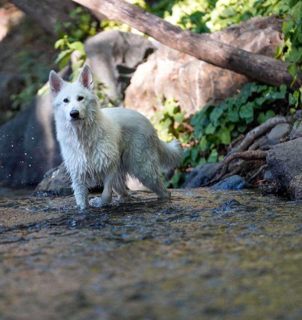 Great genetics is only the beginning of creating great, well-balanced dogs. We also take extra care in the way our puppies are born and raised. All of our White Swiss Shepherd puppies are born inside the house surrounded by family. They are exposed to all the things that happen in a household: kids, radio, television, vacuum cleaners, visitors, etc. We strongly emphasize constant contact with people, children, and other animals starting at birth. This is a critical time for their socialization. When older, puppies move out into temperature-controlled “puppy palace” and have their own playground and a daily visit to our agility area. They will interact daily with all of our ranch animals, the rest of our white pack, and all other visitors coming to our ranch. They will be exposed to different surfaces frequently, which is crucial for their sensory development. Our Puppy Academy trainees will have additional socialization and full-time puppy starter training.