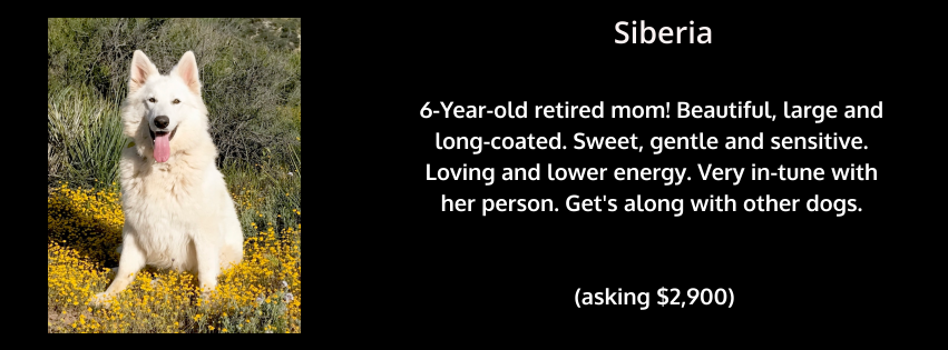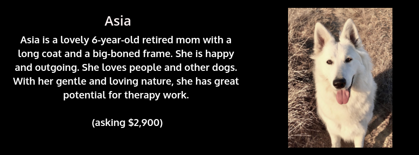 My special focus is to breed dogs with exceptionally high intelligence that exhibit easy trainability traits. Additionally, they need to have a gentle and highly intuitive disposition, making them ideal service and therapy dogs and amazing family companions. Many of our White Swiss Shepherd puppies are currently serving people with various disability needs and working as therapy dogs in schools, hospitals, and retirement homes. Given the characteristics of the breed and specifically our lines, these dogs make exceptional family dogs and get along well with other animals, small children, and the elderly.